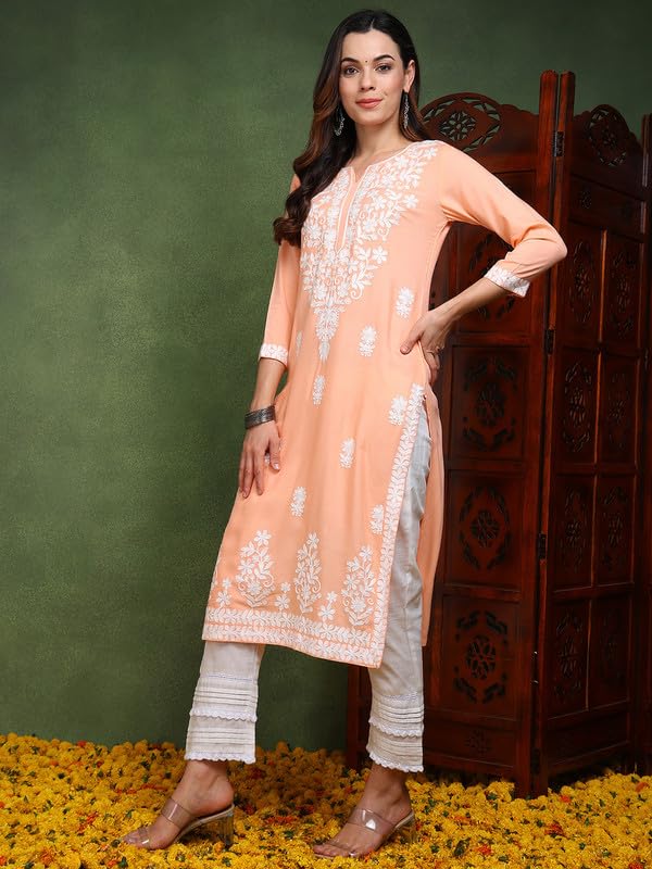 Elevate your ethnic wardrobe with this exquisite Peach Chikankari Embroidered Kurta, crafted from premium Viscose Rayon for a soft and luxurious feel. Designed to blend comfort with elegance, this kurta features intricate Chikankari thread work, adding a touch of sophistication to your look. The breathable fabric ensures ease of wear, making it perfect for all-day comfort while maintaining a polished and graceful appearance.